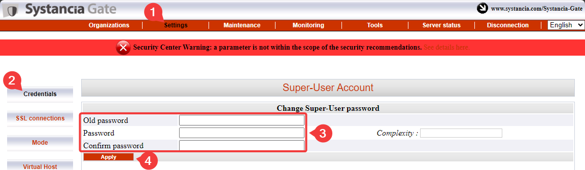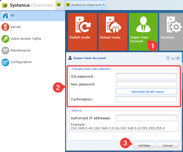 Super-User AccountFliese - Eingabe des alten Passworts und Einstellung des neuen Passworts