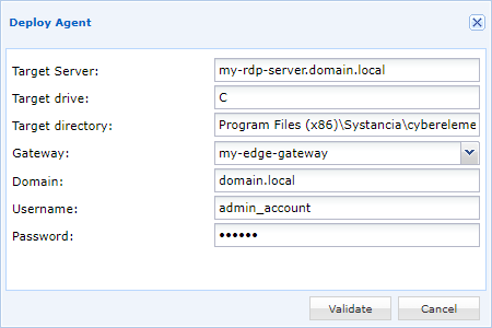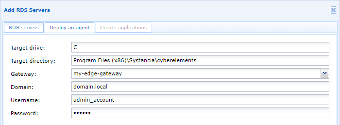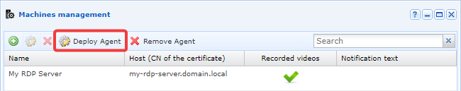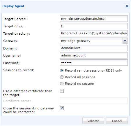 Este método sólo le permitirá desplegar el agente de grabación para trabajar con aplicaciones RDP y HTML5 RDP. Para que el agente funcione en modo de acceso directo, será necesario desplegar la configuración a través de otros medios (por ejemplo, GPO).