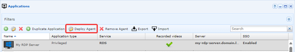 Cuando una aplicación RDP o HTML5 RDP está configurada para trabajar con el agente, la selección de la aplicación desbloquea la capacidad de implementar el agente: