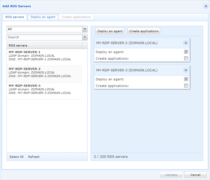Buscar y agregar los servidores para los que el agente de grabación necesita ser desplegado arrastrándolos y soltándolos en el panel de la derecha. Seleccione la opción Deploy an agent: