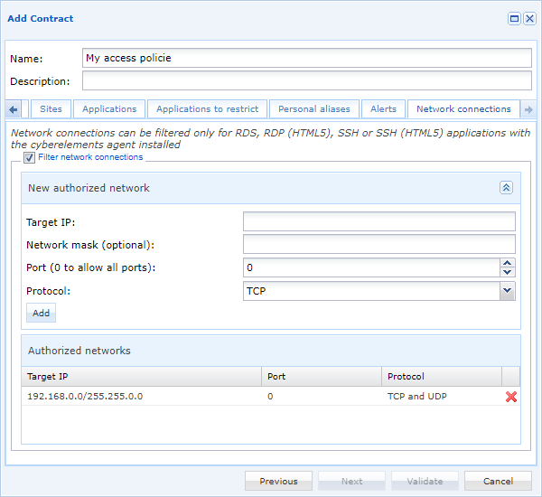 Una vez que una aplicación RDP o HTML5 RDP con agente está autorizada en una política de acceso, la pestaña Network connections se pone a disposición. Desde allí, es posible habilitar el filtrado y especificar redes autorizadas para el usuario: