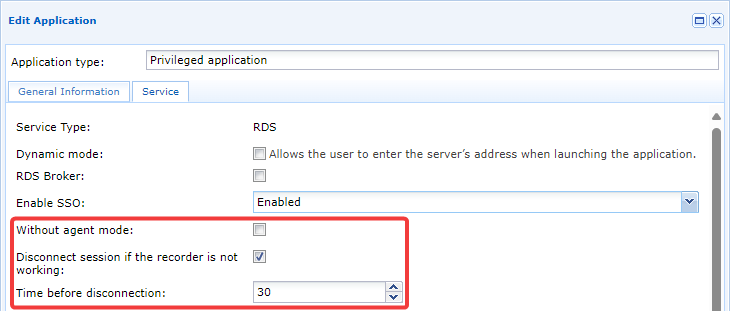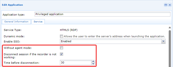 Disconnect session if the recorder is not working- Esto permite o desactiva una función de seguridad cuando la grabación de la sesión falla por diversas razones. Si la grabación no puede realizarse, la sesión RDP o HTML5 RDP del usuario se terminará. Se recomienda habilitar esta configuración para evitar conexiones de usuario sin grabación (por ejemplo, en caso de un mal funcionamiento del agente de grabación).