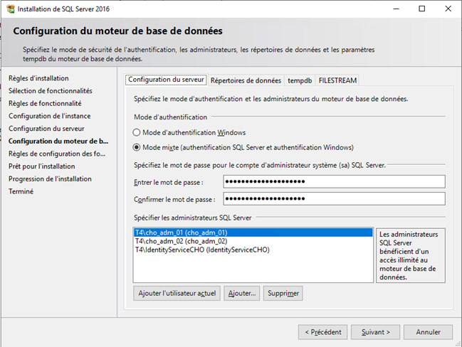 En la Configuración del motor de base de datos, elija **Modo mixto (autenticación de SQL Server y autenticación de Windows) ** e ingrese la contraseña de la cuenta de administrador de dominio.