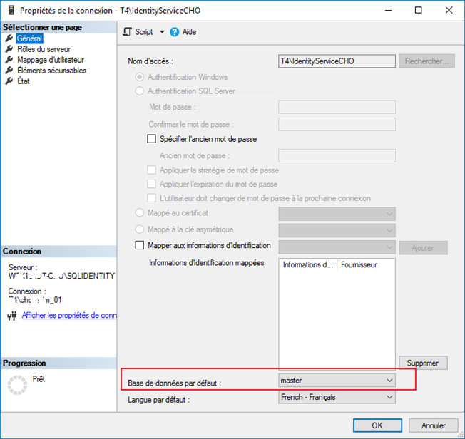 Compruebe las propiedades de la cuenta de servicio en las conexiones para asegurarse de que la base de datos predeterminada está configurada en master.