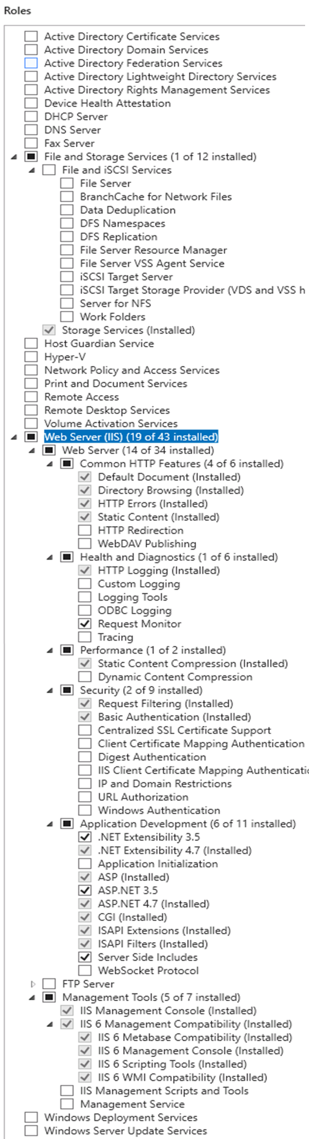 La función "Servidor web (IIS) " debe seleccionarse con al menos las siguientes opciones: